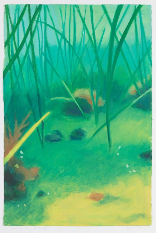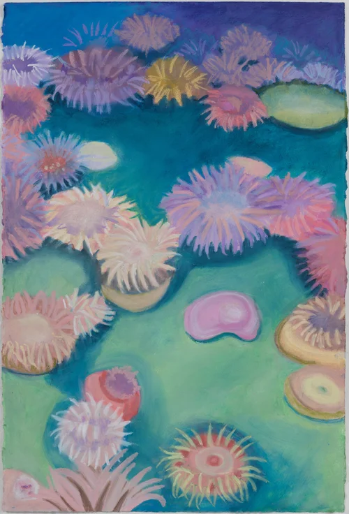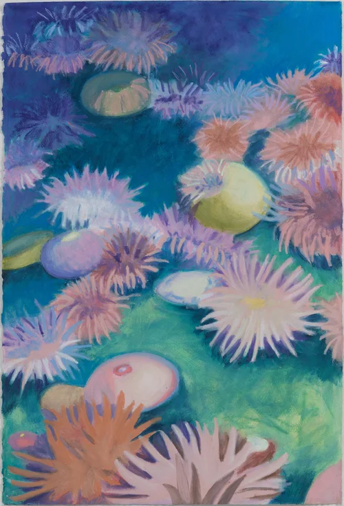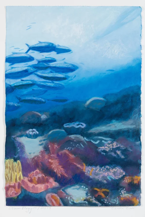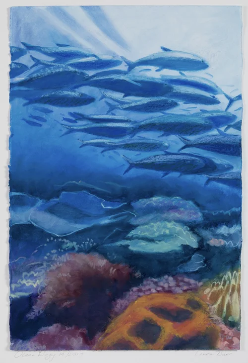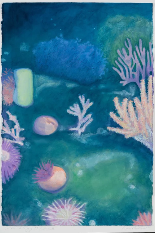 Works in the Ocean Elegy series are visual odes that celebrate the beauty of the underwater world. Beneath their outer guise of beauty, they hint at a bleak future in which we will only be able to view sea life in aquarium museums that fabricate what we have lost in our natural environment. They are expressive, observation-based paintings, informed by Google Earth screen captures to reveal otherwise unknowable, unchartered waters and imagine a world untouched by human activity. They depict fleeting moments in the hidden depths of the planet’s vast oceans.