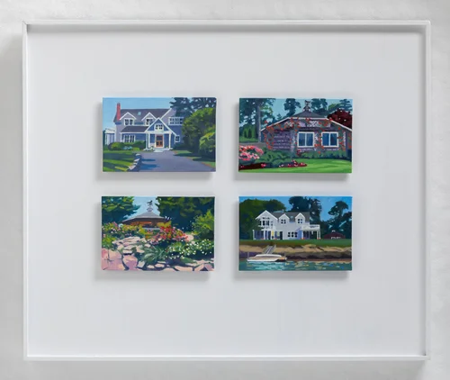The “Here and There” panels, which feature carefully curated and arranged collections of small canvases, are intended to be viewed as one work. Color, more often than subject matter, plays the dominant role in their creation.