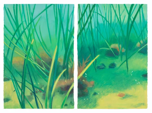 Works in the Ocean Elegy series are visual odes that celebrate the beauty of the underwater world. Beneath their outer guise of beauty, they hint at a bleak future in which we will only be able to view sea life in aquarium museums that fabricate what we have lost in our natural environment. They are expressive, observation-based paintings, informed by Google Earth screen captures to reveal otherwise unknowable, unchartered waters and imagine a world untouched by human activity. They depict fleeting moments in the hidden depths of the planet’s vast oceans.